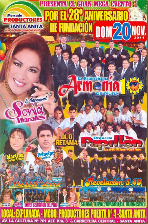 LUNES 21 DE NOVIEMBRE , día central del aniversario del icono comercial del Perú MERCADO DE PRODUCTORES DE SANTA ANITA , desde las 6 de la mañana con la salva de 28 camaretazos izamiento ,del pabellón nacional ,misa, procesión de la santa patrona SANTA ANA ,entrega de cargo del presidente Sr. MILCIADES ESPEJO y junta directiva proclamación y juramentación del flamante Presidente OSCAR APONTE y junta directiva periodo 2011- 2013.Amenizado por la criollísima LUCIA DE LA CRUZ ,el género tropical y cumbia COMPAY QUINTO,ORQUESTA LA BELLA LUZ,SOCIEDAD PRIVADA (LOBO) y LA NUEVA ESTRELLA, entre otros; el Folklore engalanado por la carismática FRESIALINDA,HAYDEE RAYMUNDO,FLOR PILEÑA,BANDA SHOW TUPAC AMARU DE HUANCAYO,ORQUESTA ASES DE HUAYUCACHI,GUAPOS DEL CENTRO, MARGARITA DE CARHUAMAYO y demás luminarias del acervo nacional.